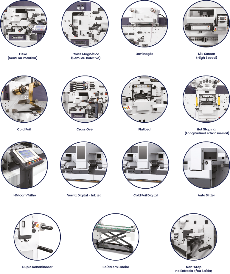 Nossas máquinas são extremamente flexíveis, rápidas e de fácil setup, com cada módulo servoacionado individualmente e projetadas com os principais componentes eletrônicos europeus. Além disso, permitem futuros upgrades com a adição de novos módulos.